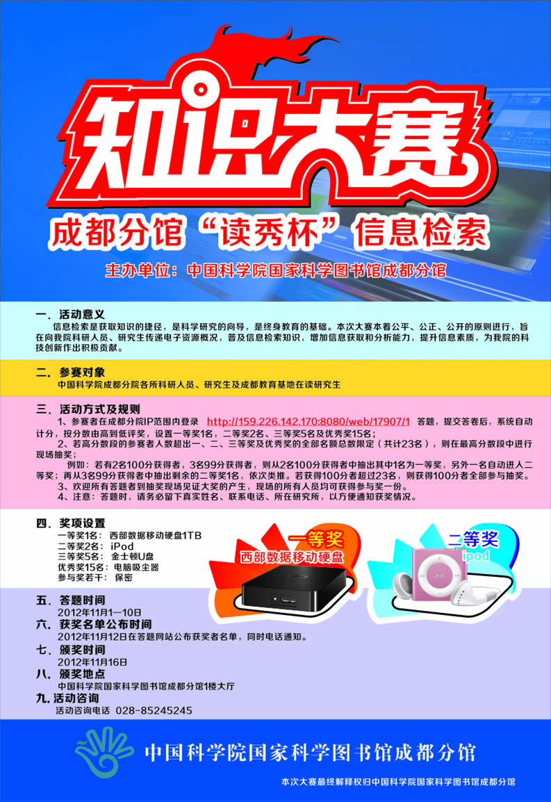 国科图成都分馆“读秀杯”信息检索知识大赛 来源: 发布时间: 2012年10月26日 附件下载: 分享: 上一条:国科图成都分馆组织青年职工参加科学道德和学风建... 下一条:国科图成都分馆参展第六届中国工业生物技术高峰论坛