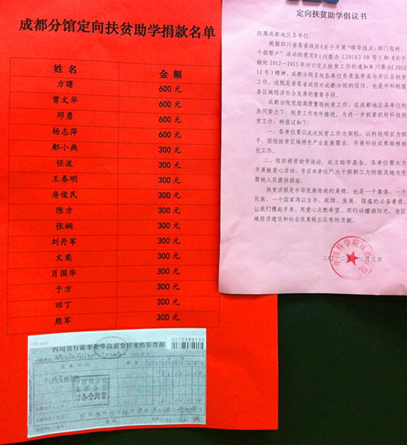 为响应四川省委省政府关于开展“领导挂点、部门包村、干部帮户”活动的号召,切实推进成都分院系统各单位负责盐亭县、开江县扶贫工作的任务,促进院地合作和区域发展,12月12日,国科图成都分馆按照分院的布置要求,积极组织领导班子成员、中层干部定向扶贫助学捐款。成都分馆馆长方曙、党委书记曾文华希望大家充分认识到定向扶贫助学活动的重要意义,班子成员率先献出爱心,中层干部也陆续捐款,活动共募集爱心资金6000元。爱心资金将投入成都分院成立的助学基金,用于对盐亭县和开江县贫困学生的资助。