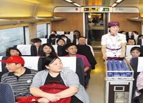 2010年5月25日,成都分馆离退休同志一行32人(占离退休人数65%)怀着激动的心情踏上旅途。一进入高铁车厢,一种强烈的现代视觉冲击感扑面而来。宽敞的车厢、大幅的液晶显示屏幕、松软的座椅、车厢扶手等快铁元素一应俱全,“和飞机舱差不多,好安逸”。坐椅一转,发现它不但可以180度旋转,还可以通过按钮调节角度,如果想睡觉,还可以将坐椅稍微放平一些。卫生间外部构造比较简洁,推开门,迎面是与窗户大小相当的两块玻璃,看上去非常明亮。玻璃下方是水龙头,依次往下放有手帕纸,卷纸。右侧放一个套好塑料袋的垃圾桶。“真的很舒服,比坐豪华旅游大巴还好!”。