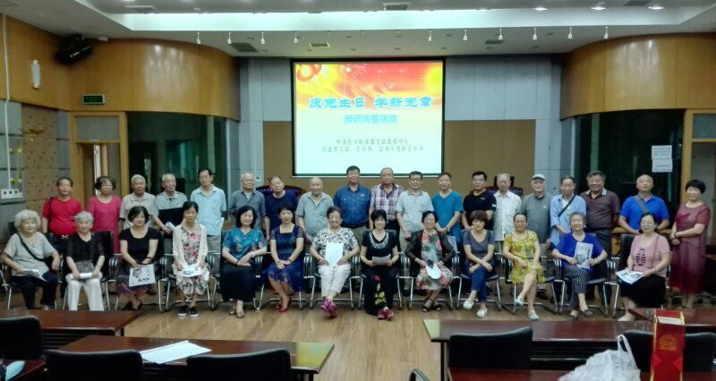 今年7月1日是我们伟大的中国共产党成立97周年的光辉日子,6月28日上午,由中心离退休党支部牵头,老科协、离退休活动小组共同举办了“庆党生日、学习新党章知识问答活动”。上午9时许,近 40位离退休老同志陆续到达中心学术厅,大家怀着对伟大的中国共产党无限热爱的深厚感情,无比喜悦地参加了活动。首先大家深情合唱了《中国》、《没有共产党就沒有新中国》两首歌曲。离退休支部成员精心准备了数十道贯穿新党章内容的问答题,各小组同志踊跃抽取问题回答。通过一个半小时的问答活动,老同志们进一步地加深了对新党章的认识理解。老同志表示:吃水不忘挖井人,我们能有今天的幸福生活,离不开共产党的坚强领导, 党章规定的“党领导一切”的政治原则不能改变,老同志要更加紧密地团结在以习近平同志为核心的党中央周围,高举习近平新时代中国特色社会主义思想的伟大旗帜,为实现两个一百年的伟大目标和中华民族伟大复兴的中国梦,贡献出自己的智慧和力量。