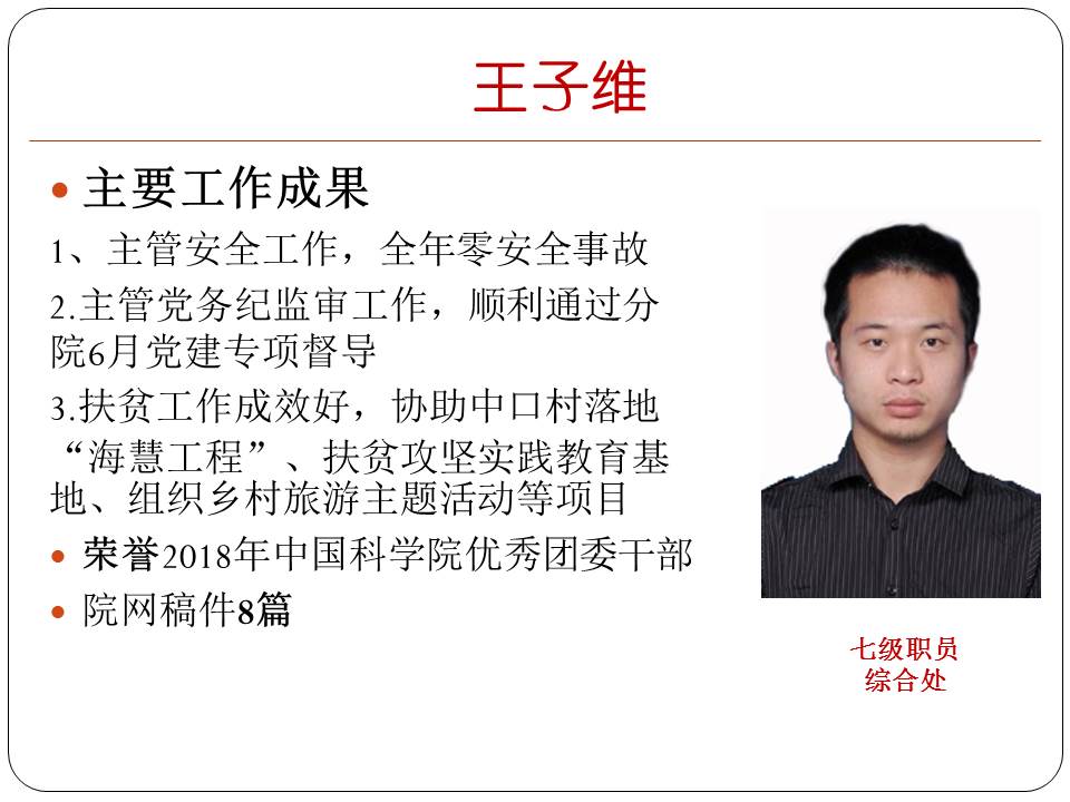2018年度优秀个人 来源: 综合处 发布时间: 2019年02月01日 2018年,中心在深入学习贯彻习近平新时代中国特色社会主义思想和党的十九大精神,紧密围绕中国科学院“率先行动”计划,取得了良好成效。为表彰先进,激励职工的工作积极性,评选张娟等10人为2018年度成都文献情报中心优秀个人,希望受表彰的个人珍惜荣誉,发挥表率作用,为推动我中心各项工作再上新台阶作出更大的贡献。同时号召中心全体职工向受表彰的个人学习,积极做好本职工作,为建设科技智库贡献更大力量。 分享: 上一条:成都文献情报中心第二党支部开展“讲爱国奉献、当时代先锋”主题学习活动 下一条:成都文献情报中心举行离退休职工迎新春联欢会