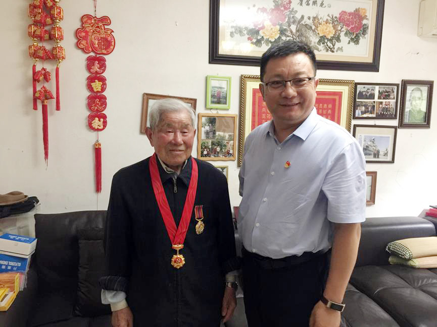 邓勇慰问 “光荣在党50年”纪念章获得者肖维文同志,并为肖维文同志戴上纪念章。