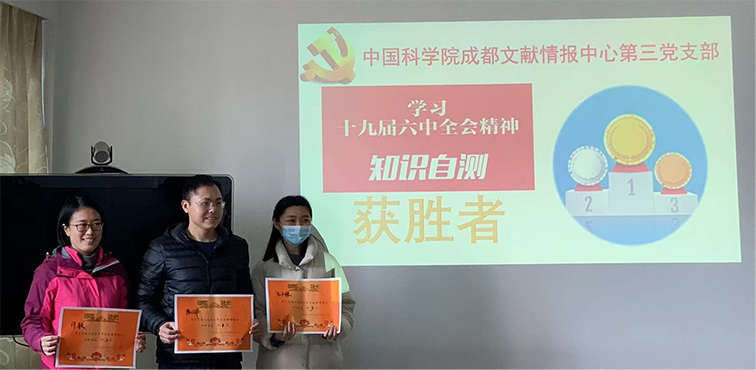 第三党支部在11月主题党日活动“线上学习党的十九届六中全会精神”的基础上,认真贯彻落实《成都文献情报中心党委关于认真学习宣传党的十九届六中全会精神的工作方案》,深入学习《中国共产党第十九届中央委员会第六次全体会议公报》《中共中央关于党的百年奋斗重大成就和历史经验的决议(简称“决议”)》。李姝影、周海晨、胡乃华、曹玲静四位同志结合中科院“基础研究十条”、党建与业务融合发展等做了重点发言。全体党员还积极参与“学习党的十九届六中全会精神知识自测”答题比赛,陈云伟、许轶、万子琛斩获前三。