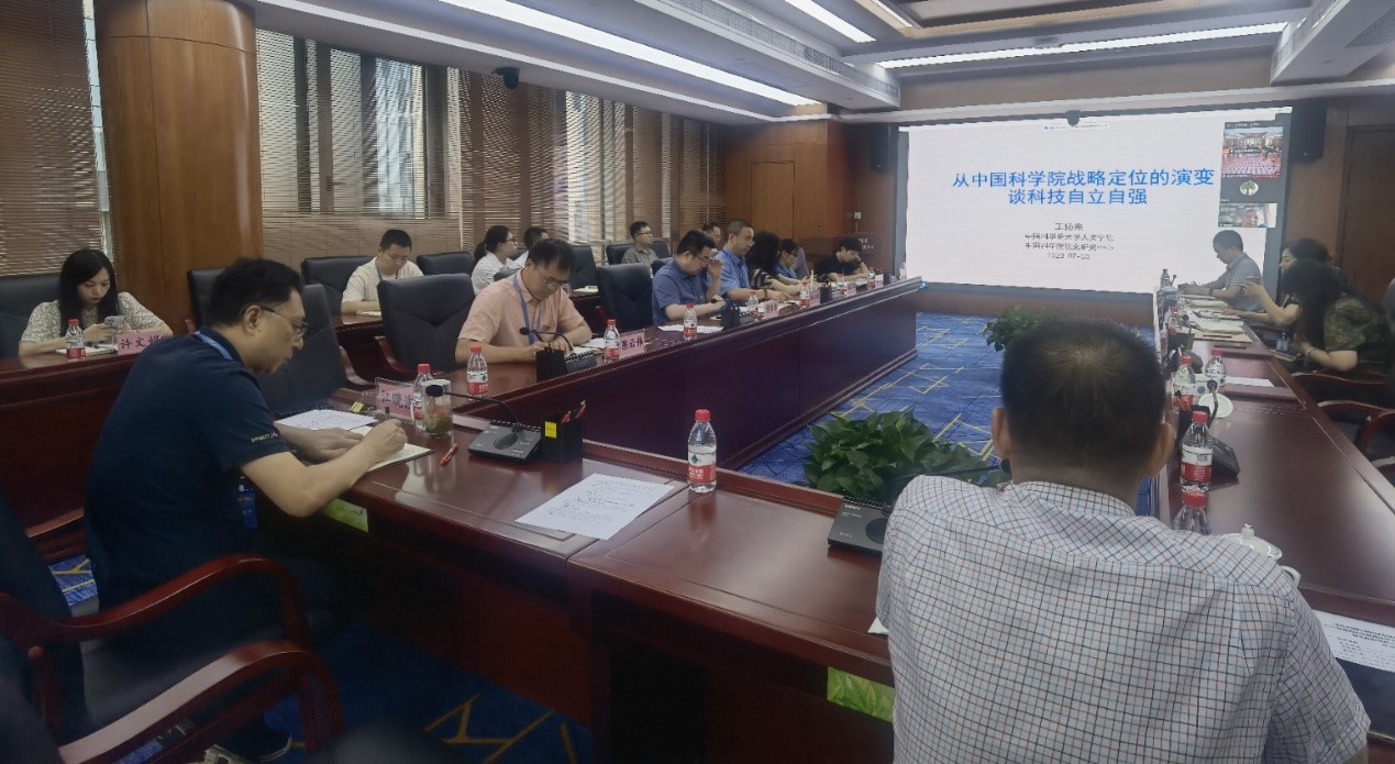 会议还学习传达了近期党中央、中国科学院党组关于学习贯彻习近平新时代中国特色社会主义思想主题教育相关文件精神。发展咨询部主任肖国华、综合处处长熊军分别作了重点发言,与会人员进行了学习交流。