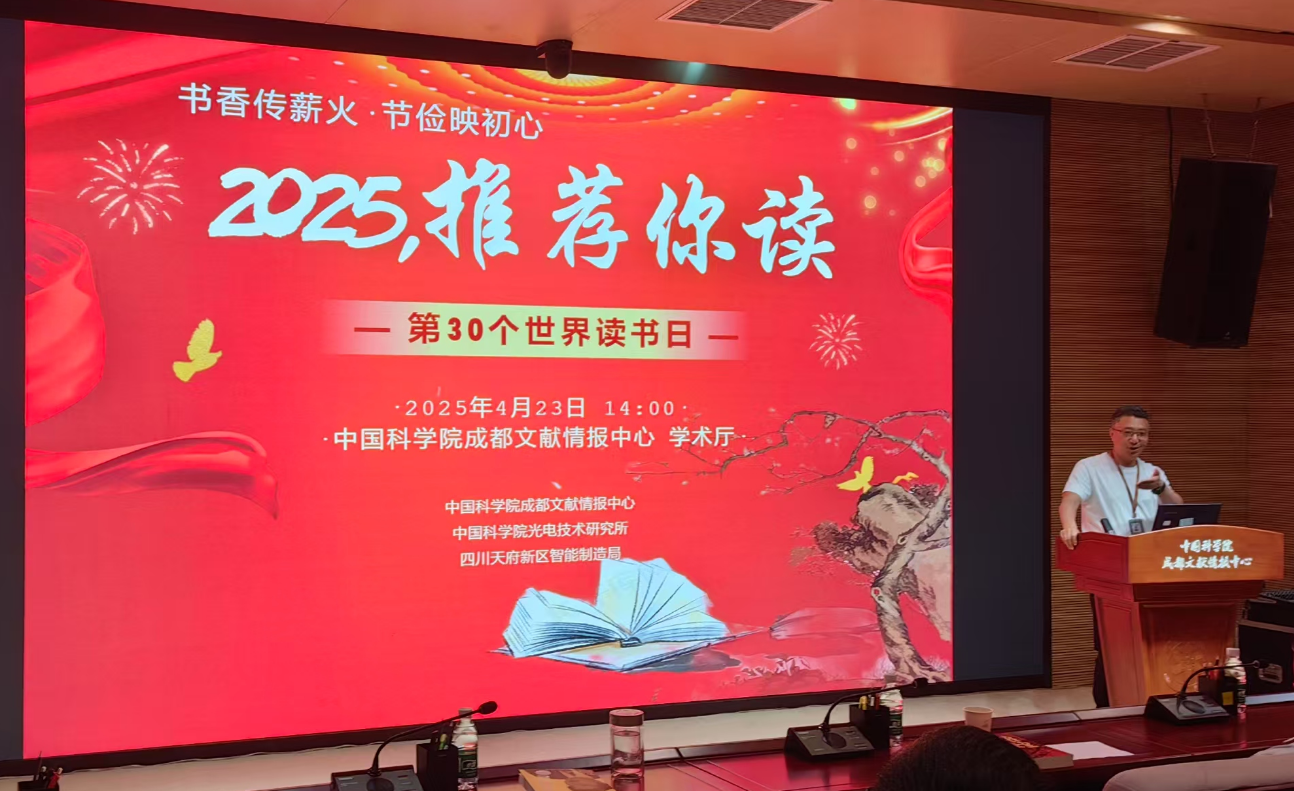 2025年4月23日,在第三十个世界读书日到来之际,为推动党建与业务工作深度融合,中国科学院成都文献情报中心第三党支部联合中国科学院光电技术研究所第一、二、三党支部以及四川天府新区智能制造局机关党支部,共同举办了以“书香传薪火·节俭映初心”为主题的“2025推荐你读”读书分享活动。中心纪委书记江晓波参加活动。活动由第三党支部书记谢黎主持。