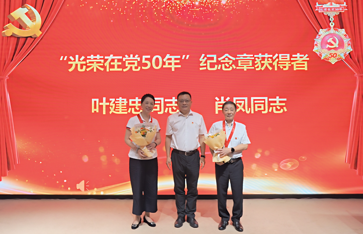 党员大会在庄严的国歌声中拉开帷幕。党委书记曲建升向中心退休党员叶建忠同志和肖凤同志颁发“光荣在党50年”纪念章并献花。纪念章是对叶建忠、肖凤等老一辈党员同志五十年与党同行,五十载初心如磐的肯定和礼赞,同时也激励和鼓舞全体党员继承和发扬中心老一辈党员砥砺奋进、艰苦创业的精神,持续拼搏、不懈奋斗,全力推进中心各项工作大步向前。