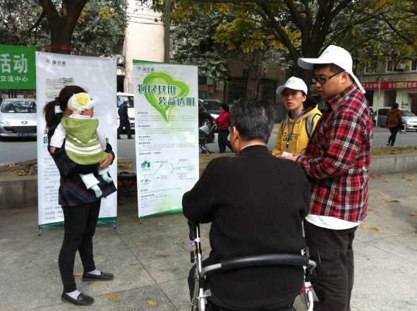 当日早上9点半,活动在成都分院篮球场拉开了序幕。来自成都分馆的工作人员和其他志愿者们一起向民众宣传推广树木净化空气的科学原理以及废纸回收再利用节能减排、循环利用资源的环保理念,讲解了废纸再利用能够有效节电、节水、避免了因填埋废渣造成对周边地下水的污染、减少固体废物、工业废气排放等相关科学环保知识,希望大家积极加入到植树造林,爱护地球生态的队伍中来。不少群众在听到宣传后,即可返回家中搜寻旧报纸、杂志、纸箱等后又返回活动地点进行捐献。