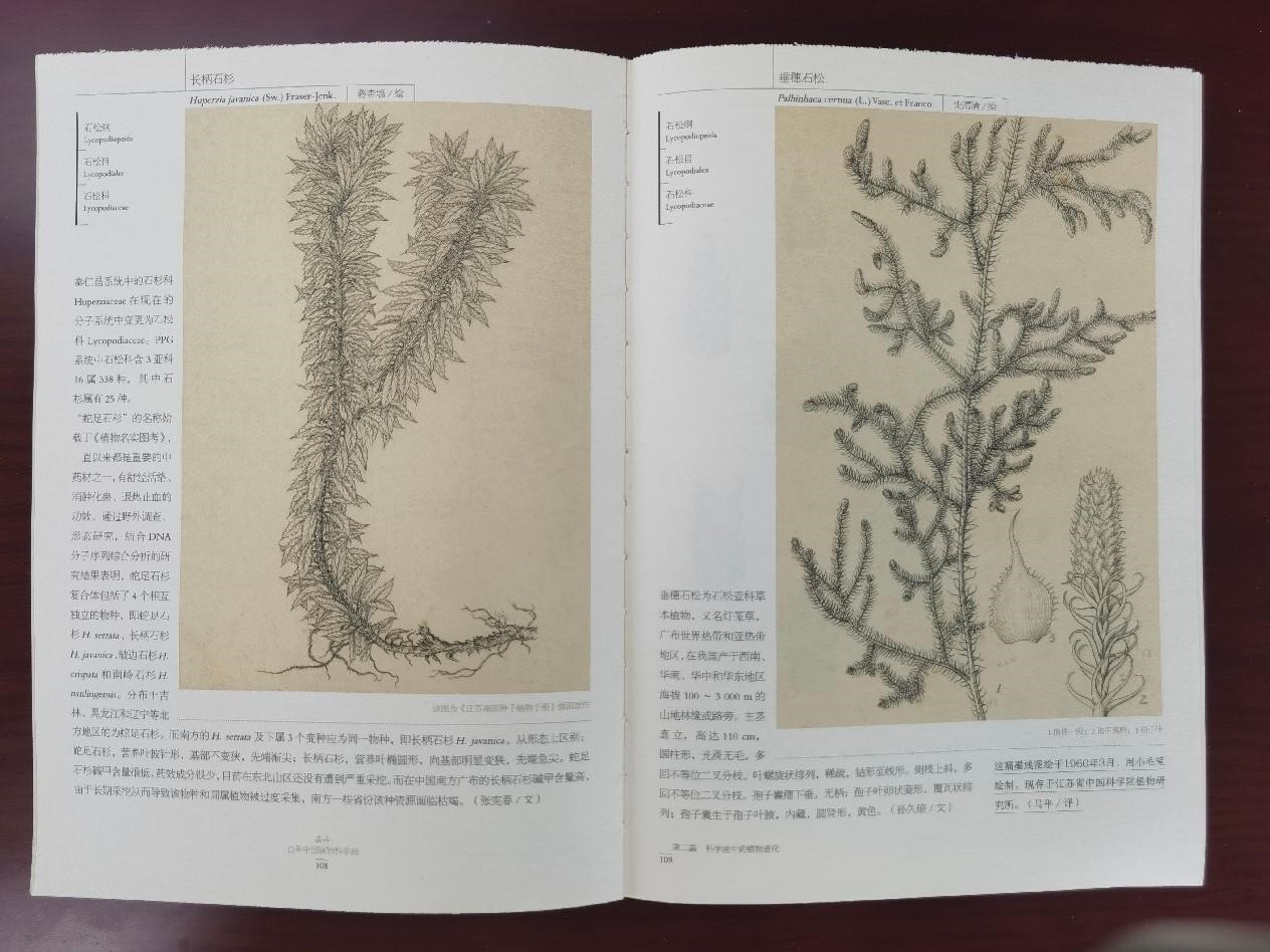 随手一翻,便被第一幅图所惊艳(下图右边的《垂穗石松》)。简单的墨线勾勒,把一株草本植物刻画得纤毫毕现、生机盎然。疏朗而自然伸展的枝条,螺旋状排列的松叶密而不乱,每根叶子都有自己的生长方向和姿态,可以看出绘者对大自然的敬畏和高超的笔墨功夫。