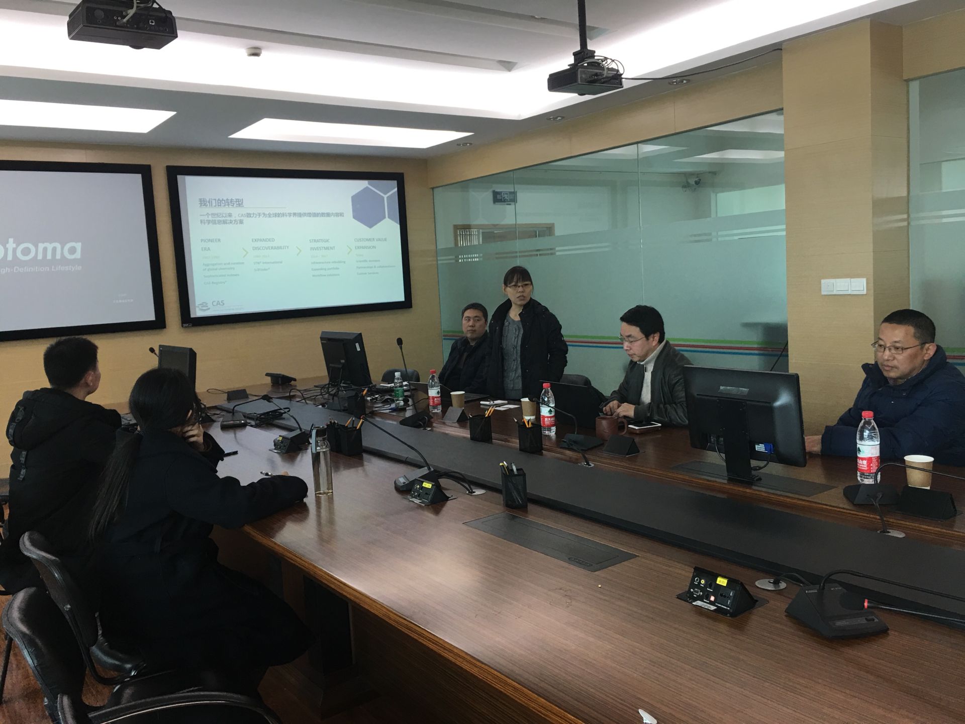 胡正银向余敏一行介绍了干细胞信息化项目的目标定位、研究内容、研究进展及下一步重点工作计划。余敏介绍了美国化学文摘社的核心产品SciFinder、主要知识服务内容以及在生物医药领域知识发现的典型案例。
