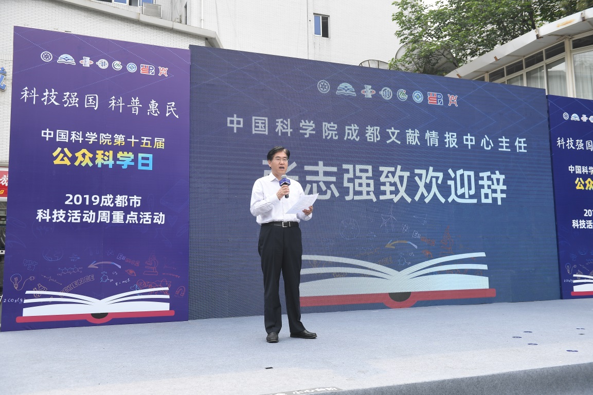 中心主任张志强代表组委会致欢迎辞。张志强表示,习近平总书记关于科技创新与科普工作的一系列重要论述,对于在新的历史起点上推动我国科学普及事业的发展意义重大。科学素质是公民素质的重要组成部分,大力提高公民科学素质,才能厚植科技创新的社会文化土壤,这对于提高国家自主创新能力,建设创新型国家乃至科技强国的重要意义不言而喻。科普是创新型国家建设的重要支柱,国家队就要勇担科普国家之责。“中科院公众科学日”就是中科院加强公众科学传播活动的“广而告之”的宣传日。中国科学院作为我国建成创新型国家和建设世界科技强国的国家战略科技力量,一直都十分重视促进高端科研资源科普化,主动承担科普传播任务,不断创新科普传播模式,为建设创新型社会、学习型社会提供科学文化支撑。中国科学院成都文献情报中心作为中国科学院文献情报系统的主要组成部分,是国内科技文献信息资源最丰富的国家级科学图书馆,是科学知识汇聚的宝库和殿堂,是科技创新和科普教育的信息资源高地。在“创新,开放,协同,跨界,共享,和谐”的发展理念指导下,我们不断探索将高端科研信息资源科普化的方式方法,以促进科学知识的社会化广泛传播和普及。