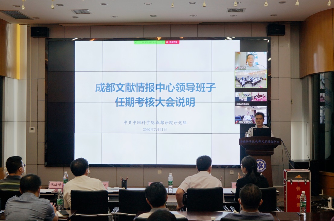 7月21日,中科院成都文献情报中心召开领导班子任期考核大会。中科院人事局副局长蔡宏志、文献情报中心主任刘会洲、成都分院分党组书记王嘉图、分党组副书记刘刚君,中科院人事局领导干部处以及成都分院组织人事处、监察审计处相关领导等组成的考核组参加了会议。由于疫情原因,会议采用现场与视频同步进行的方式召开,中科院人事局领导、文献情报中心党委书记何林等通过视频会议方式参加大会。成都文献中心领导班子成员、党委委员、纪委委员、中层干部、党支部书记、职代会代表、业务骨干等40余人参加了会议。会议由王嘉图主持。