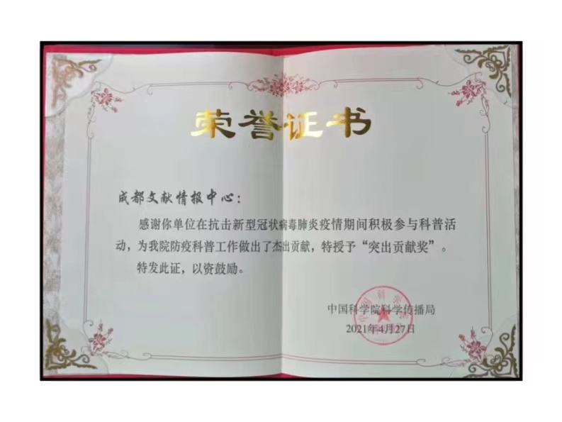 近期,中科院成都文献情报中心因抗疫期间科普工作突出,被中科院科学传播局授予“突出贡献奖”。