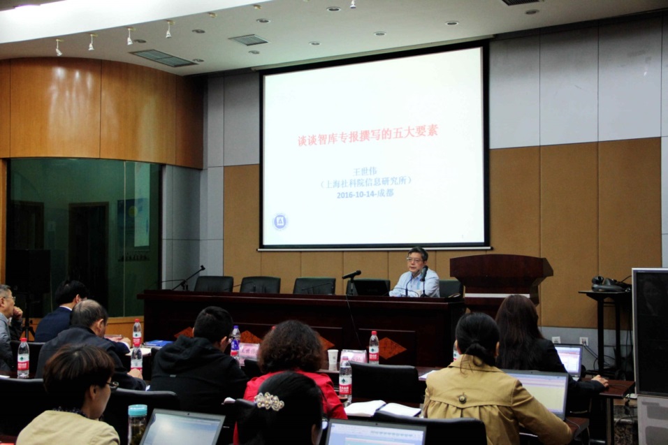 为进一步加强中科院成都文献情报中心向专业型科技智库转型发展,强化决策咨询知识服务的智库型人才队伍建设,10月14日上午,中科院成都文献情报中心邀请上海社会科学院信息研究所王世伟研究员做题为《智库专报撰写的五大要素》的专题报告。成都文献情报中心情报研究与决策咨询服务和政务信息工作人员,以及来自成都分院、光电所、成都生物所、山地灾害与环境所、成都有机化学公司、四川省科技信息研究所等单位的相关研究人员共60多人听取了报告。中科院成都分院分党组书记王学定参加会议。报告由成都文献情报中心主任张志强研究员主持。