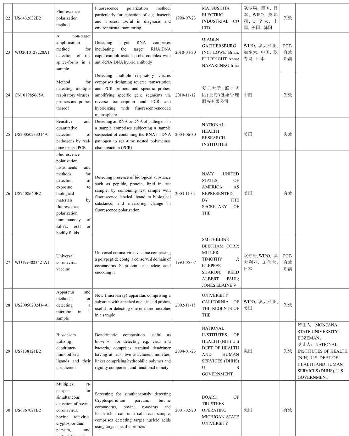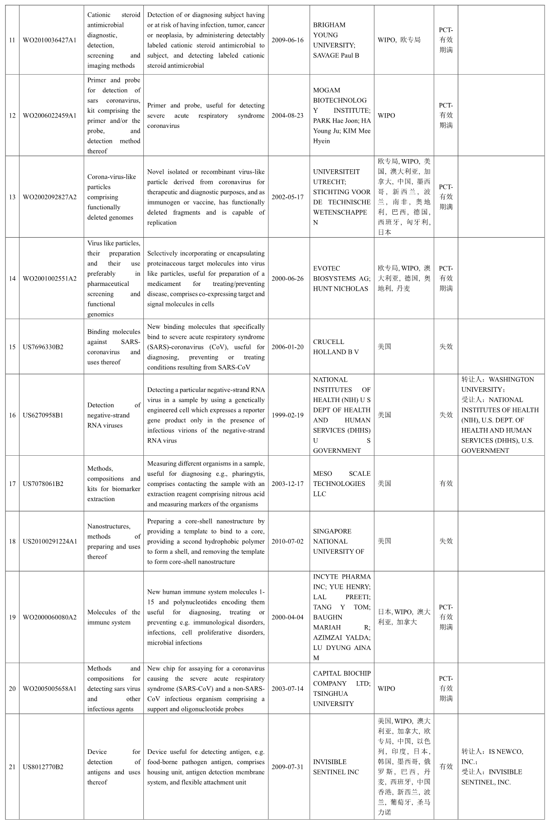 本文利用冠状病毒和检测等关键词与IPC号相结合,检索了迄今为止有关冠状病毒检测技术相关的专利申请,整理了一部分受到业内高度关注的现有专利技术(详见下表),期望可以为本次疫情有效检测试剂的研发提供信息参考。
