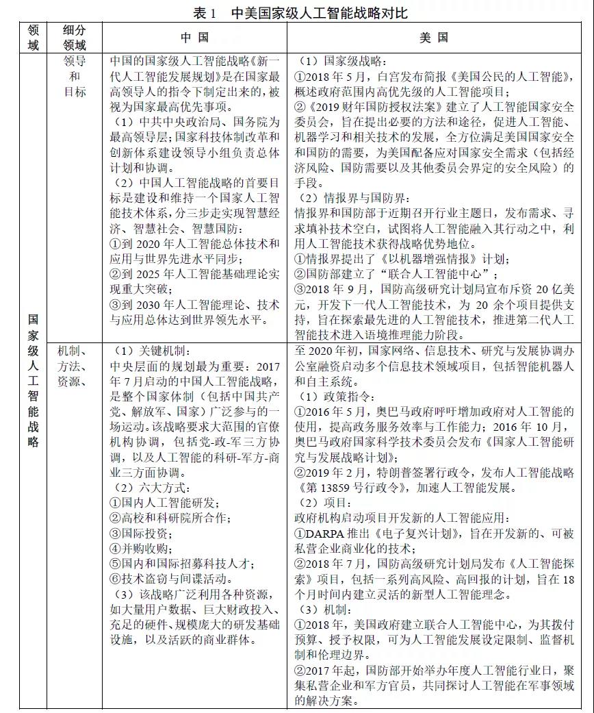 1.1 国家级人工智能战略方面,中美两国势均力敌