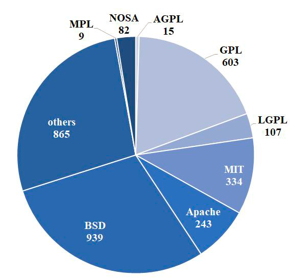 在本报告调研的开源科学软件所遵守的开源许可协议中,BSD许可占据了主导地位。