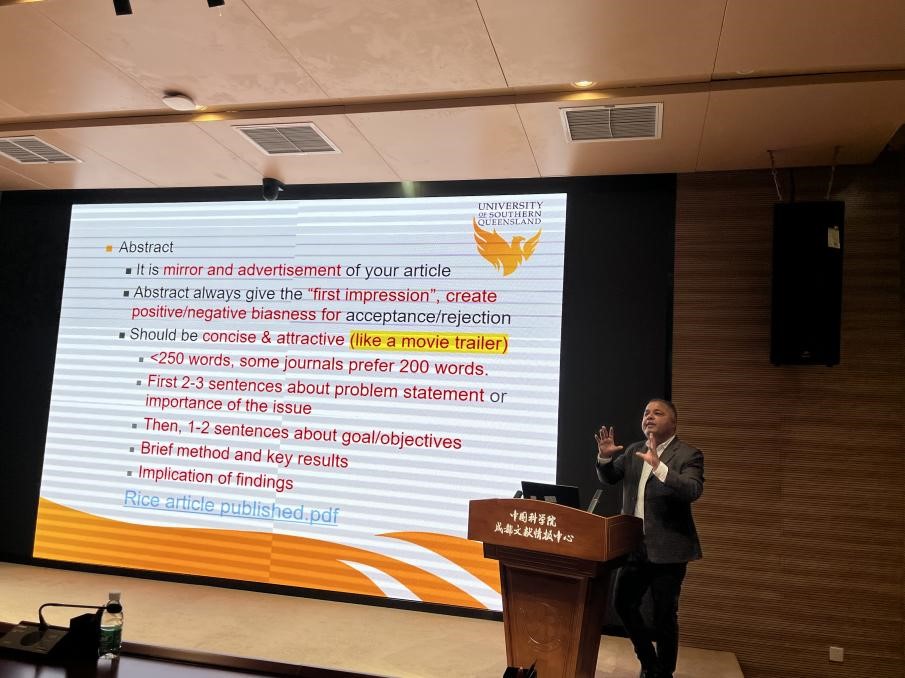 1月3日,澳大利亚南昆士兰大学可持续流域中心执行副主任Tek Maraseni教授访问中国科学院成都文献情报中心,并作了题为“Art and science of writing a quality journal article”的学术报告,成都文献情报中心党委书记曲建升主持报告,成都文献情报中心研究人员及国科大成都学院研究生现场参加报告交流。
