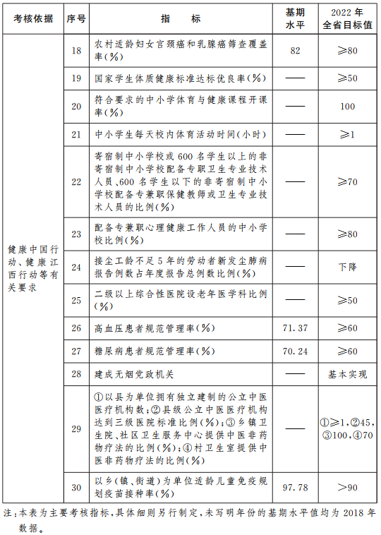 第十六条 考核实行百分制评分,考核细则由健康江西委员会另行制定。考核主要指标结合国家有关要求及我省实际情况,适时动态调整。
