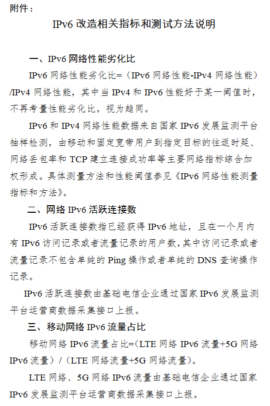 (一)IPv6网络性能与IPv4趋同,平均丢包率、时延、连接建立成功率等指标与IPv4相比劣化不超过10%。