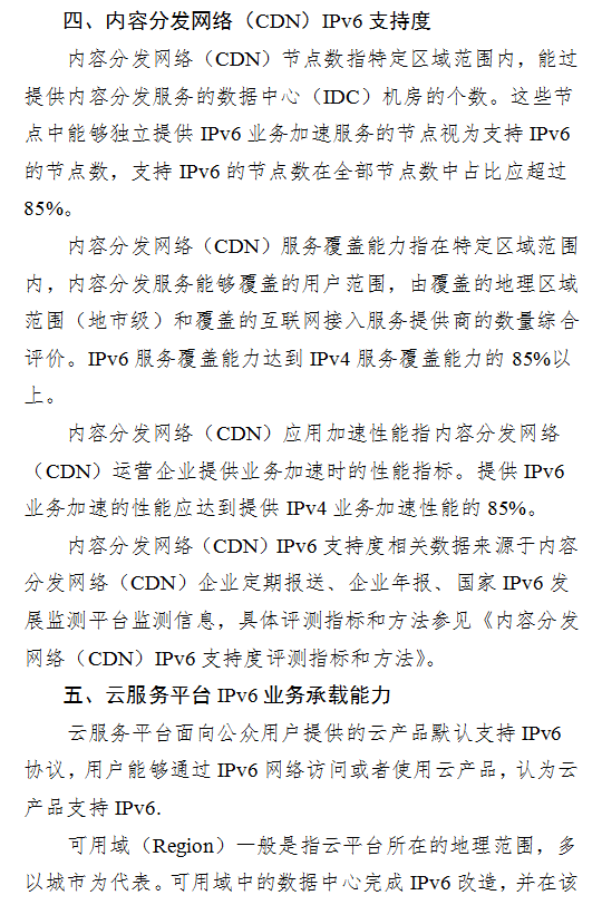 (三)完善技术监测。中国信息通信研究院要会同相关企业和产业联盟持续完善IPv6发展监测平台,开展IPv6端到端网络性能监测,内容分发网络(CDN)、云平台、行业移动互联网应用(APP)、行业网站等的IPv6支持程度监测等工作,定期发布IPv6发展监测报告。各相关企业要配合做好监测节点部署工作。