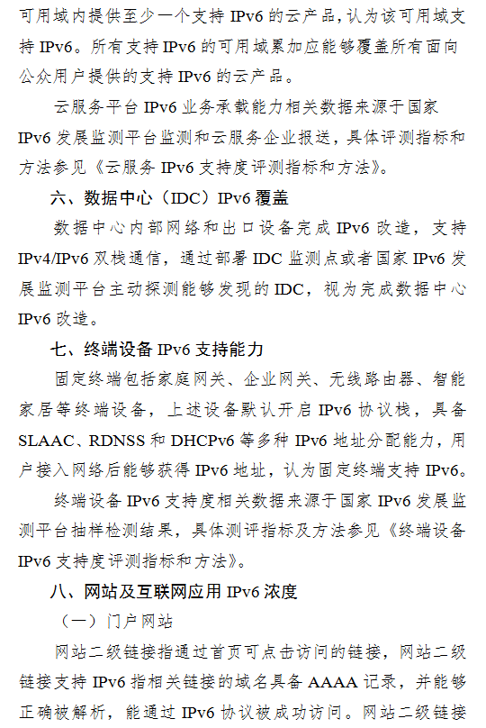 (六)稳步提升行业网站及互联网应用IPv6浓度。各省(区、市)通信管理局、部属各单位、部属各高校、基础电信企业继续深化门户网站IPv6改造,到2020年末,门户网站二级、三级链接的IPv6浓度达到85%以上。