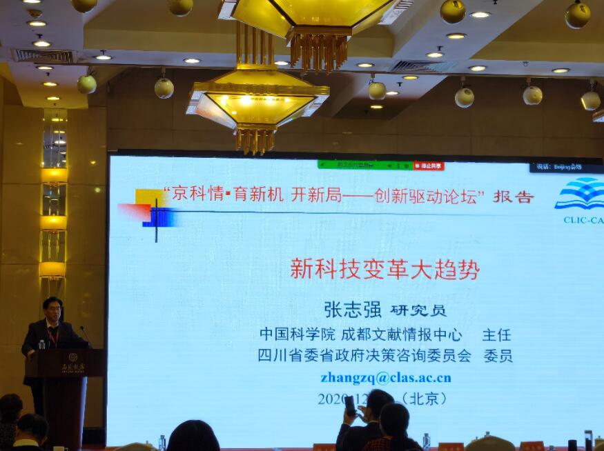 2020年12月25日,由北京市科学技术研究院主办,北京市科学技术情报研究所、北京科学技术情报学会承办,北京科技经济信息联合中心协办的“京科情·育新机 开新局——创新驱动论坛暨2020年北京科学技术情报学会年会”召开。中国科学院成都文献情报中心主任张志强研究员应邀作了题为《新科技变革大趋势》的主题报告。