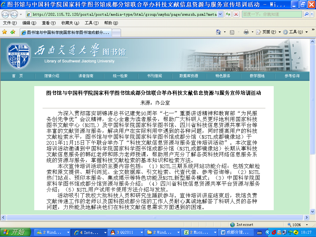 2011年11月15日下午,成都分馆信息服务部组织开展的科技文献信息资源与服务巡回宣传活动来到了素有“中国铁路工程师的摇篮”和“东方康奈尔”之称西南交通大学。西南交通大学历史悠久,是一所以工科为主,工、理、管、经、文、法等多学科协调发展的多科性大学,是进入国家“211工程”、“特色985工程”建设并设有研究生院的全国重点高校。
