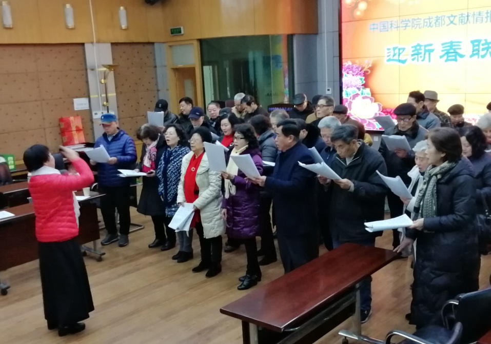 联欢会上,老同志们将近年来学习的部分歌曲,以合唱的方式集中汇报演出。红歌联唱《东方红》、《社会主义好》、《没有共产党就没有新中国》、《伟大的国家伟大的党》、《团结就是力量》;红歌联唱;儿歌联唱《世上只有妈妈好》、《卖报歌》、《娃哈哈》、《两只老虎》、《让我们荡起双桨》等等。合唱分为全体大合唱、小组合唱两种形式,同时增加领唱和舞蹈。红歌联唱部分大家整齐洪亮的歌声中老同志们精神焕发,正能量满满;儿歌联唱中老同志童心未泯,或可爱或搞笑的舞蹈,让大家欢乐开怀。合唱间隙还进行了活泼生动的猜地名游戏、吉祥新春祝福语活动。