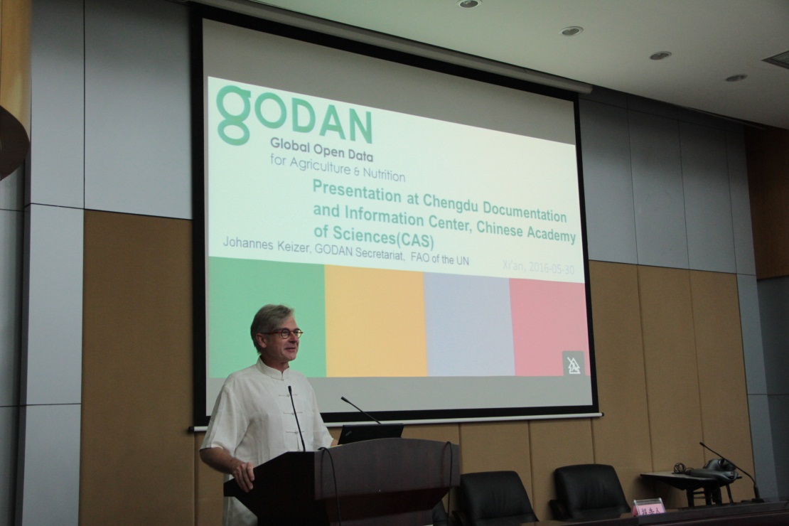 会议特别邀请了联合国粮食组织(FAO)“全球农业及营养开放数据”(Global Open Data for Agriculture and Nutrition,GODAN)秘书处主任、战略合作伙伴负责人Johannes Keizer博士做了题为“ Better Agriculture, Food Security, Improved Nutrition, the Challenge of Open Data”的主题报告,就开放农业数据在解决粮食危机、害虫管理、粮食污染等问题方面的巨大效益,以及GODAN数据库的结构功能以及全球开放使用情况做了深度解读,还以实例讲解了目前GONDAN在倡导农业及营养数据开放、形成农业智库以及知识网络上所作的贡献,并希望GODEN与中国相关机构开展进一步的合作。会议还邀请了中国农业科学院农业信息研究所张学福研究员作了《农业科技信息共享发展与实践》、潘淑春研究员作了《农业知识管理与共享发展与趋势》专题报告。成都文献情报中心姜恩波研究员作了《科学数据与科学文献的融合》、柴苗岭副研究馆员作了《农业科学数据的知识组织及应用》的专题报告。