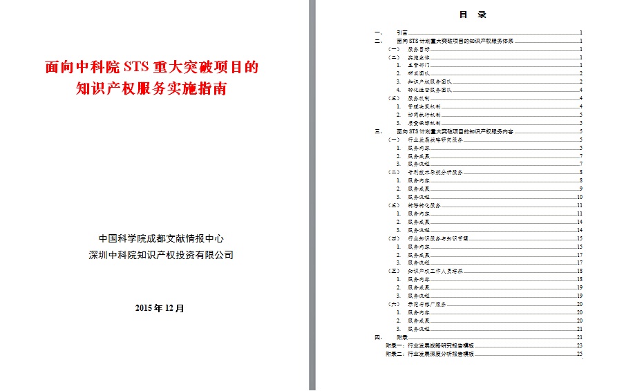 为更好地支撑中国科学院科技服务网络计划(Science and Technology Service Network Initiative,简称STS网络)重大突破相关项目的推进实施,将知识产权分析和运用融入到STS计划重大突破的技术创新、产品创新、服务创新和管理创新的过程中,充分发挥知识产权战略研究与运用在STS计划重大突破的产业技术创新方向和路线选择、创新资源配置、产业化应用、行业发展中的决策支撑与导向作用,特制定面向中科院STS计划重大突破的知识产权服务实施指南。本指南紧扣中科院STS计划重大突破相关主题的知识产权需求特点,梳理了面向STS计划重大突破项目的知识产权服务体系的服务目标、实施主体、服务机制,系统介绍了包含的服务内容、成果形式与实施流程,制定了服务产品的参考模板,供STS计划重大突破相关项目的知识产权服务工作参考。