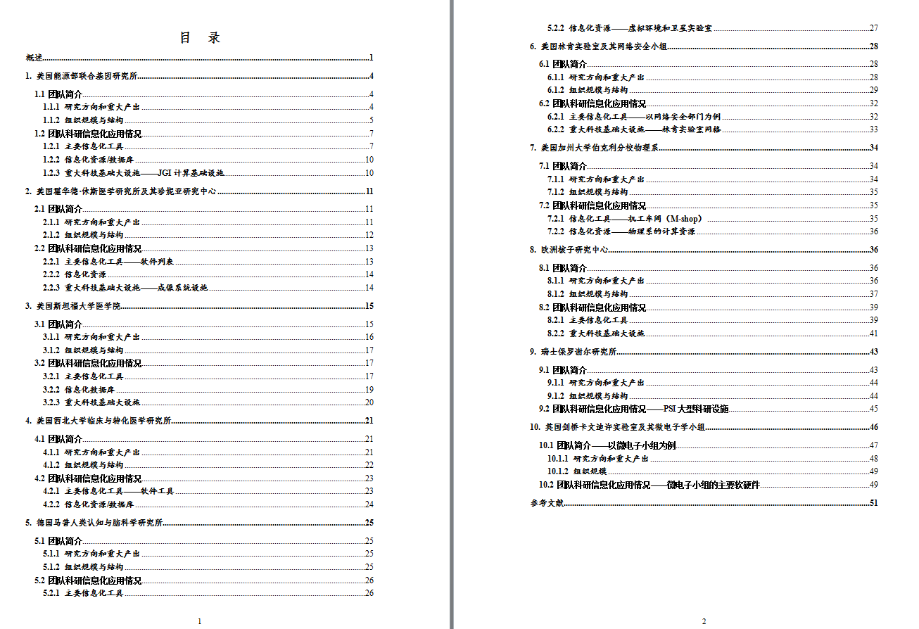 “国际顶尖科研团队信息化应用现状调研”专题报告重点调研了国际上具有重大产出的十个顶级科研团队,从团队研究方向、重大成果、组织结构及其所利用的信息化工具/资源/大型科研设施等多方面展开调查与总结。这些科研团队的研究领域涉及生物学、医学、网络安全、物理学等,团队具体包括:完成人类基因组部分染色体解码分析工作的美国能源部联合基因研究所、引领医学研究/临床实验及教学的美国斯坦福大学医学院、揭示人类语言障碍等疾病原因的德国马普人类认知与脑科学研究所、验证地月数据传输的美国林肯实验室、位居2014年全球高校学术排名物理系第1位的美国加州大学伯克利分校物理系、探测到希格斯粒子的欧洲核子研究中心、创造出锗锡半导体激光器的瑞士保罗谢尔研究所以及产生29位诺贝尔获奖者的英国剑桥卡文迪许实验室等。