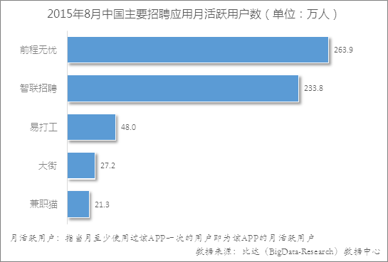 比达(BigData-Research)数据中心监测数据显示,在2015年8月中国主要招聘月活跃用户数方面,前程无忧月活跃用户数为263.9万人;智联招聘月活跃用户数为233.8万人,紧随其后;其他招聘应用月活跃用户数相对较少。