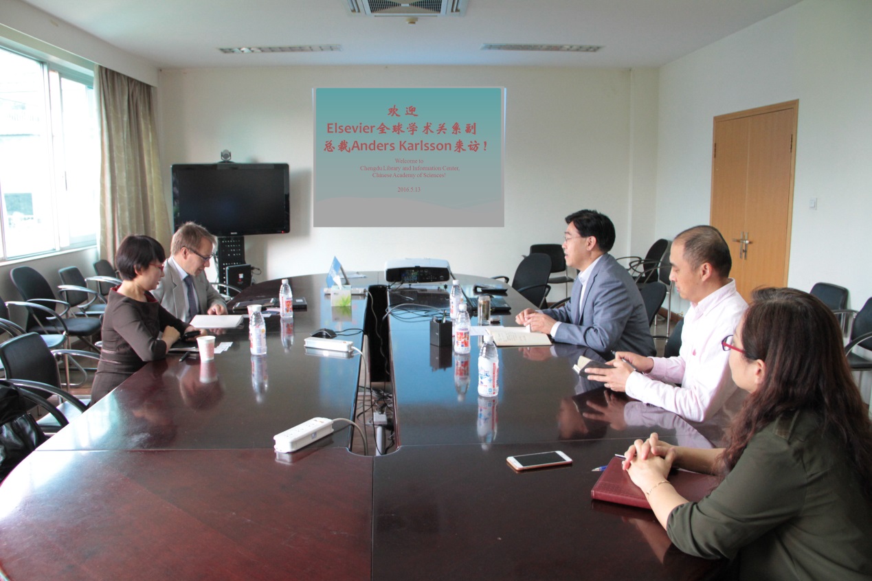 张志强等与Anders Karlsson等首先举行了简短会谈交流。Anders Karlsson主要介绍了Elsevier的最新发展情况以及与中科院有关单位的合作情况,希望通过到成都文献情报中心的访问和交流,进一步了解成都文献情报中心、中科院西南地区各研究所的工作重心及研究所科研用户对Elsevier数据库及期刊出版方面的需求,以进一步完善科研服务体验,尤其推动与中科院各所在期刊出版、可持续发展研究等方面的合作。张志强主要介绍了中科院文献情报系统发展情况、基于数据库的知识服务开展情况、科技领域与区域发展情报研究与决策咨询情况,以及介绍了成都文献情报中心的业务体系和知识服务与决策咨询开展特点等,双方都表示要进一步加强学术联系和业务合作。