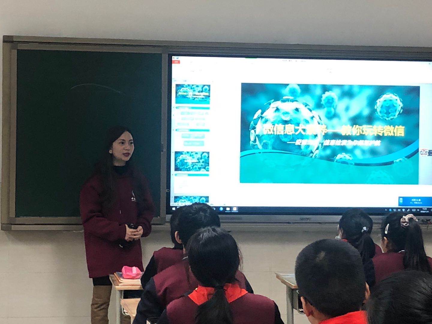 中心科普人员许文娟和杨况骏瑜就时事热点开发制作了科普课程《微信息大素养——教你玩转微信》及《神秘的5G通信》。《教你玩转微信》以疫情期间的新闻为例,为学生们生动具体地介绍了微信信息源的选择方法和鉴定方法,手把手帮助学生掌握鉴别鱼龙混杂的微信信息的科学方法。《神秘的5G通信》简单介绍无线通信与有线通信的原理,形象风趣的描述了5G通信的特点并引导学生畅想5G时代的变化。课堂上,许文娟还给学生科学普及了信息检索的基础知识并推荐了不少信息查询网站,受到了热烈欢迎。