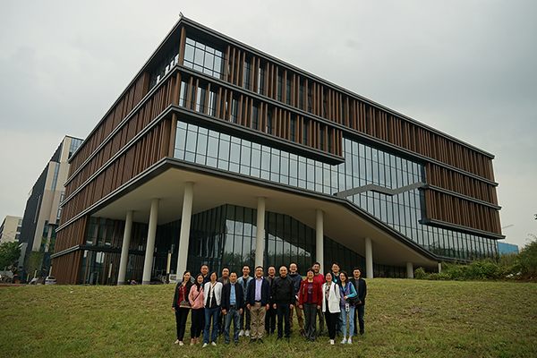 中心领导与先期入驻的部门负责人和入驻人员在新馆大楼前合影