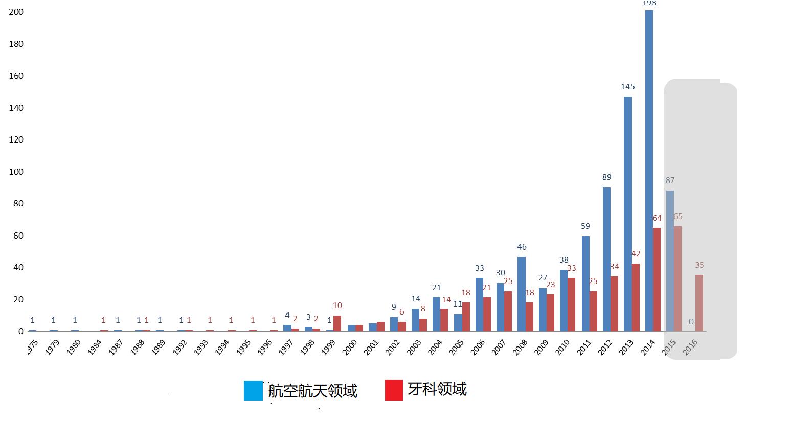 图1 3D打印技术在牙科和航空航天产业专利发展趋势[1],[2]