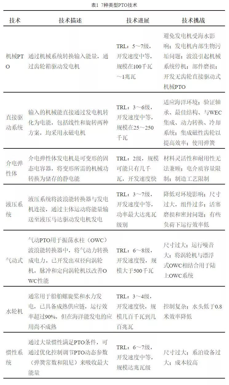 创新潮流能和波浪能PTO技术类型包括:机械式、直接驱动式、介电弹性体、液压系统、气动式、水轮机、惯性系统。表1列出了7类技术的进展和挑战。