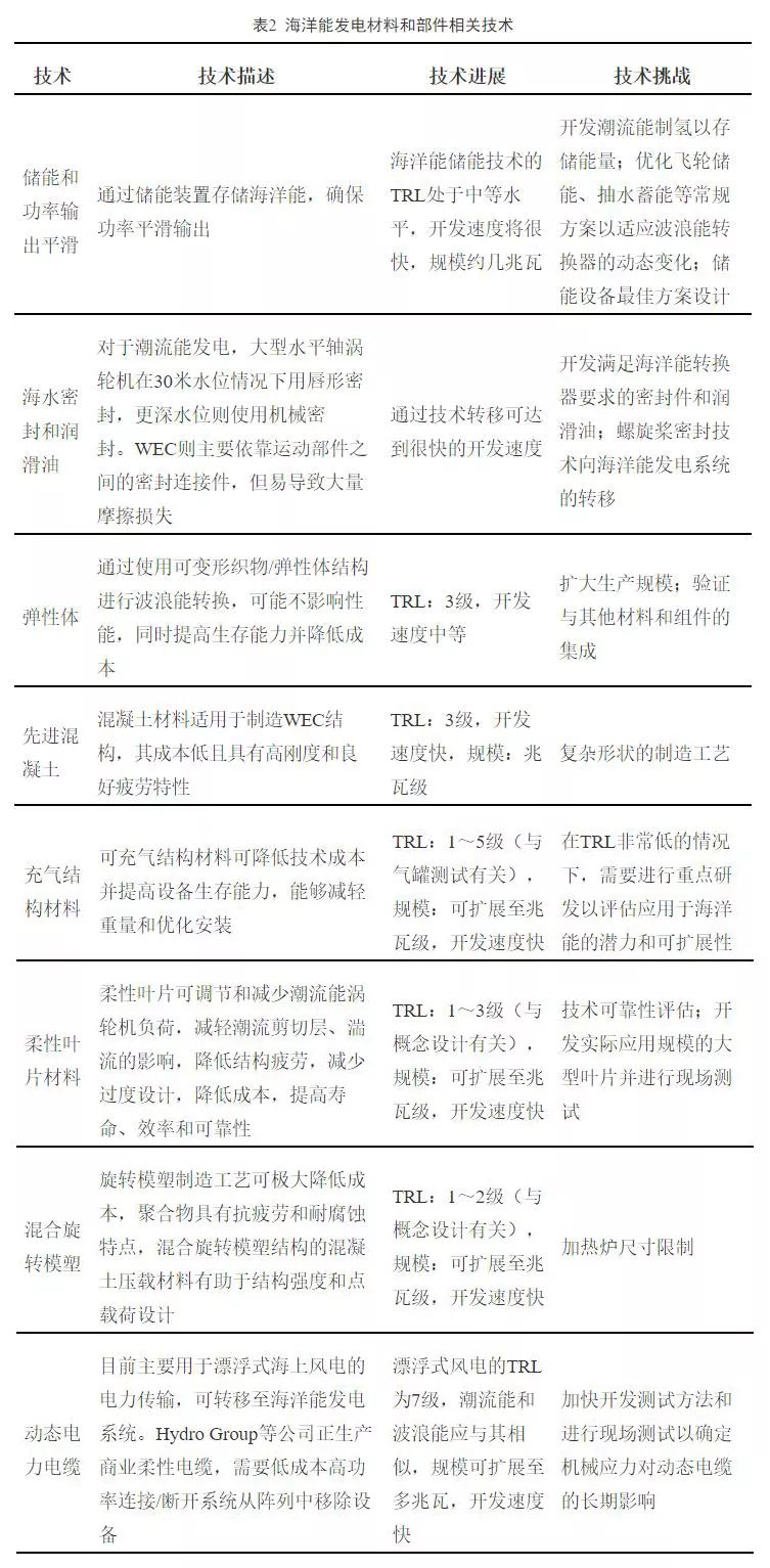 海洋能的材料和部件必须在新的运行条件和高性能要求下在恶劣的海洋环境中使用,表2列出了用于海洋能发电的8类材料和部件相关技术的进展和挑战。