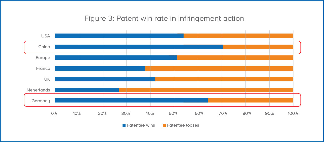究其原因,对专利权人来说,德国有两点特别具吸引力的地方:首先,德国是一个两院制的国家,即侵权和专利的有效性在两个不同的法院分别裁决。若专利权人向地方法院提起侵权诉讼,为了质疑专利的有效性,被控方必须向德国联邦专利法院提交无效诉讼。但是,如果地方法院法官判定侵权,那么在专利的有效性裁决前,专利权人通常也会获得禁令。该制度对专利权人更友好;其次,统计显示,在被研究的国家中,德国及中国在侵权案件中判定专利权人胜诉的比例最高。德国专利权人的胜诉率为52%,中国为58%(见图3)。