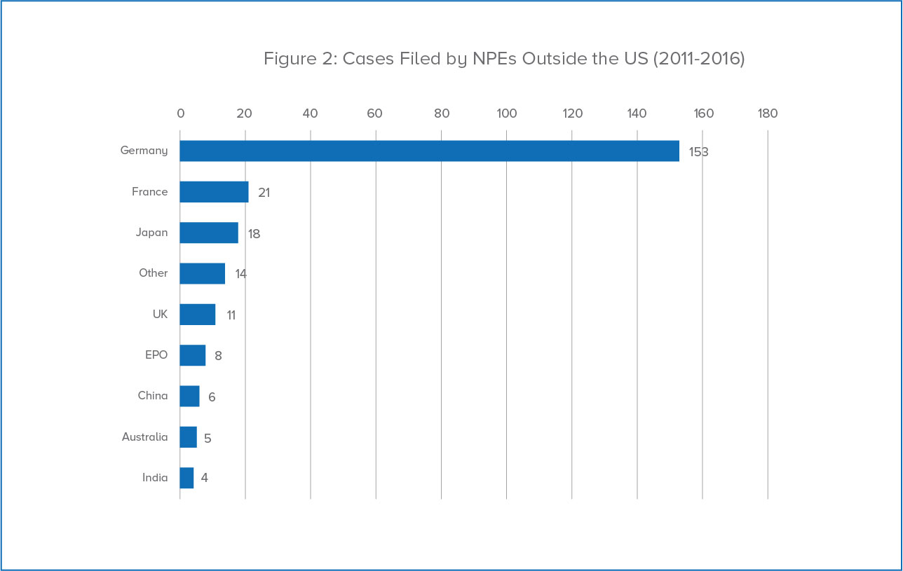 2017年3月,知识产权案例数据库Darts-ip发布报告称,NPE(Non-Practicing Entity,非执业实体)专利诉讼正成为一个全球性问题,美国的专利改革和新专利法案使NPE引起的专利诉讼减少,可能会促使NPE转向美国以外的区域。报告讨论了美国境外的NPE活动,包括NPE诉讼案件的增长速度、受理法院、涉及的产业以及对企业的影响。