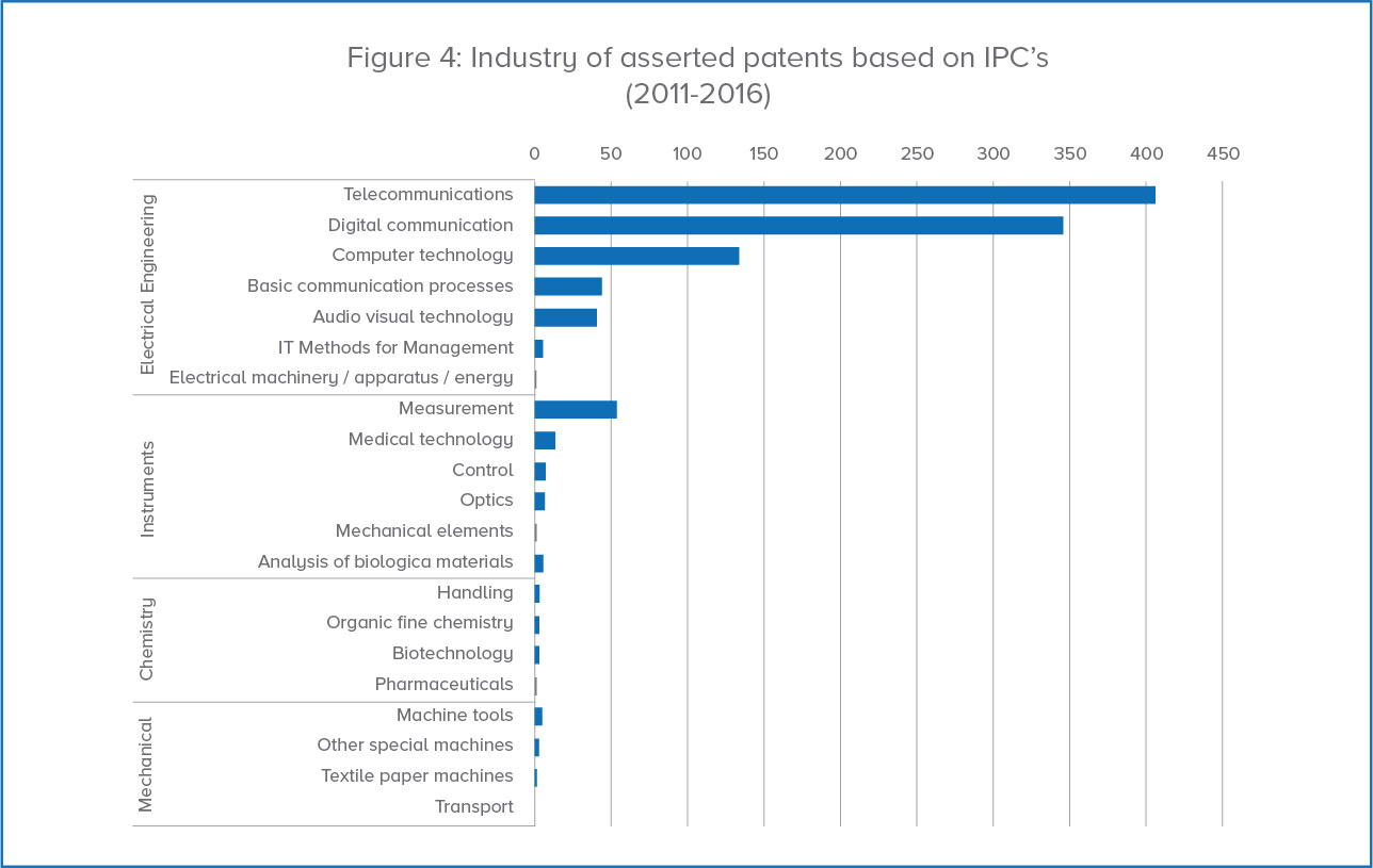 5年来美国境外的NPE诉讼案件量增加了250多起(如图1)。虽然相比美国提交的12000多起诉讼案仍非常少,但3/4左右的美国境外NPE诉讼发生在2015年和2016年;此外,美国境外的诉讼案件仅统计了已经宣布听证会或做出裁决的案件,而美国境内则统计了所有的起诉案,其中包括很大一部分在法庭之外调解解决的案件。