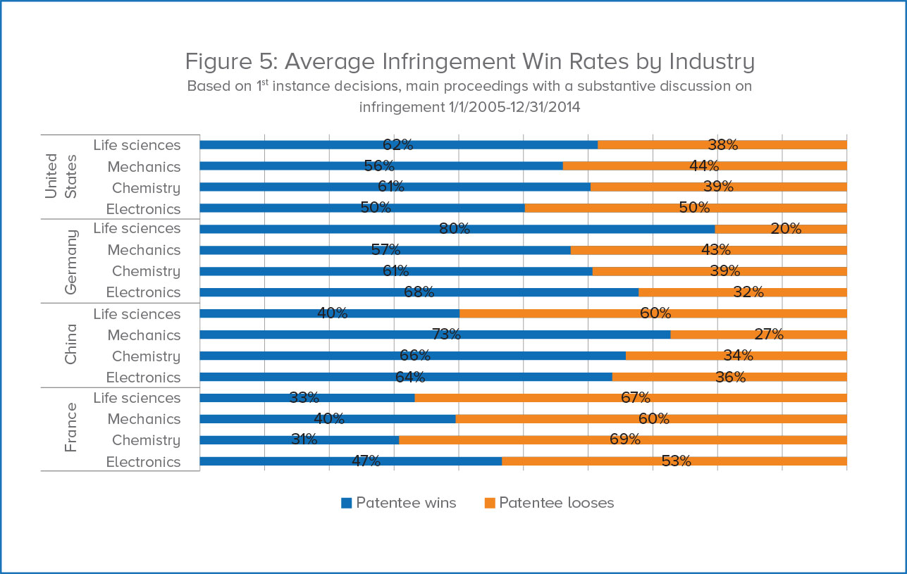 此外,德国、法国和中国在电子产业的专利权人胜诉率要高于生命科学、机械与化学产业(如图5)。