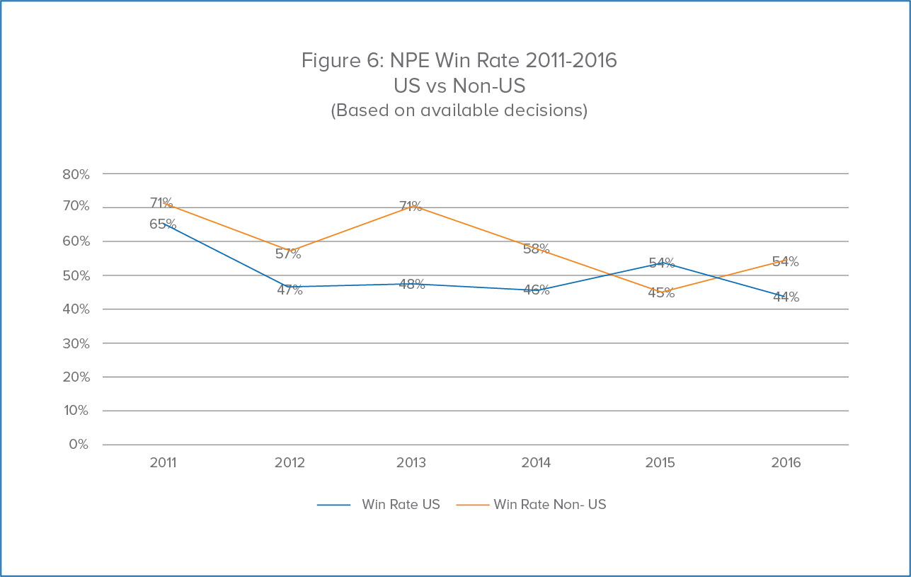 近5年来,除了2015年,NPE在美国境外的胜诉率更高(图6)。美国不断变化的规则导致了这种现象。例如,2013年,美国27个州制定了遏制专利蟑螂相关立法,旨在惩罚恶意专利诉讼。此外,美国境外如德国等两院制国家专利权人的胜诉率通常较高。