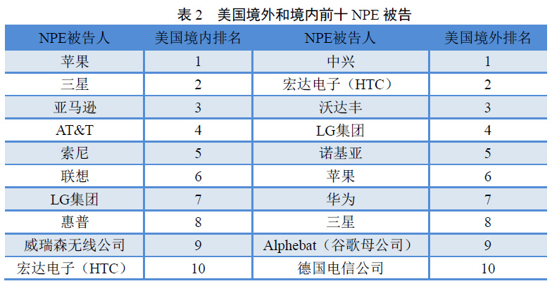 美国境内和境外的主要NPE被告都是高科技公司(表2)。美国前10的NPE被告人中有一半在美国境外也是主要的NPE被告。在美国境外,被NPE起诉最多的公司包括华为、诺基亚、中兴、沃达丰、谷歌和德国电信。