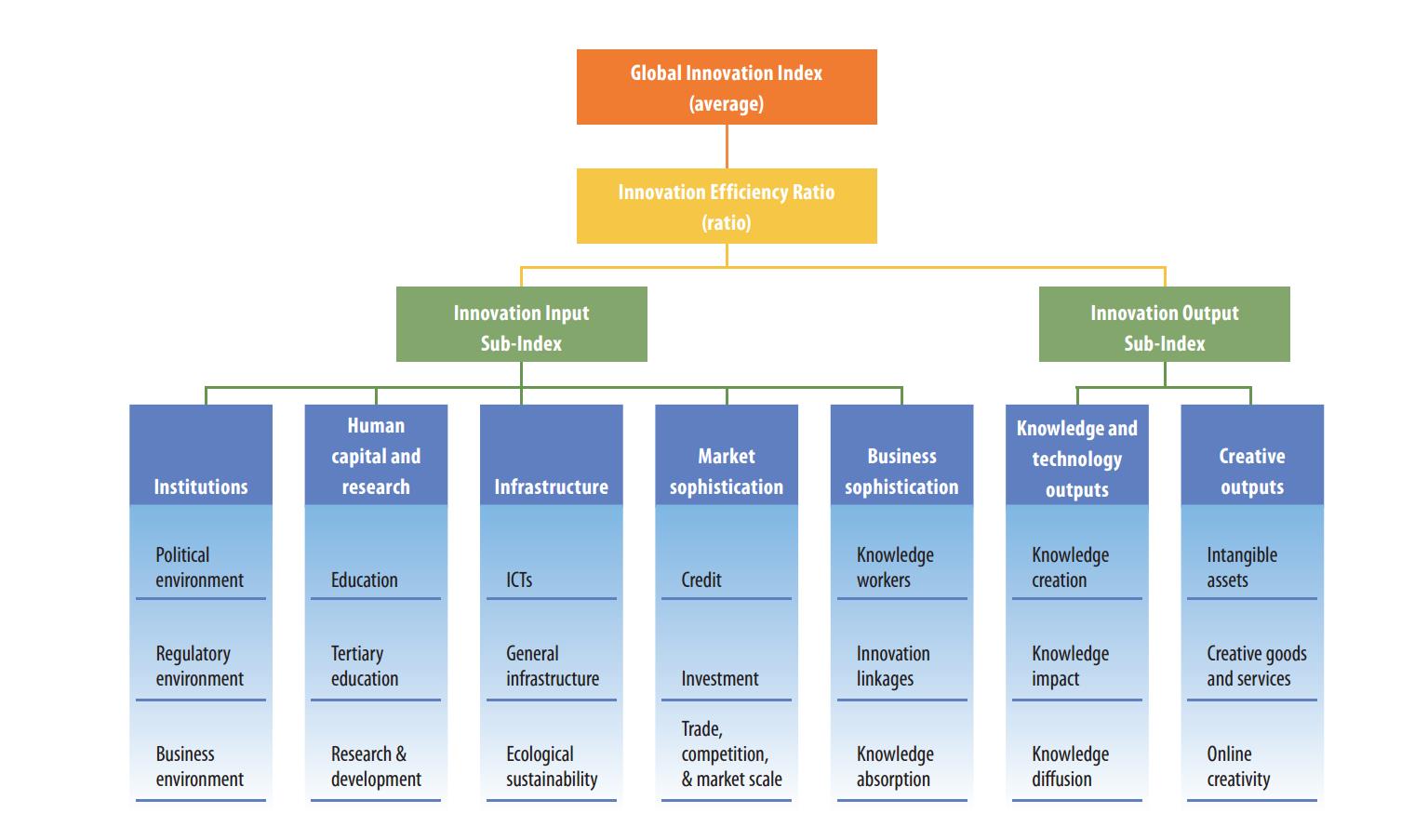 2017年6月15日,全球创新指数报告(GII)发布,GII创新指数主要通过创新效率比进行测度,分为投入和产出两个分指数。投入分指数包括政策制度环境、研发人力资源、基础研究设施和市场成熟度五个维度;产出分指数包括科技产出和创意产出两个维度。