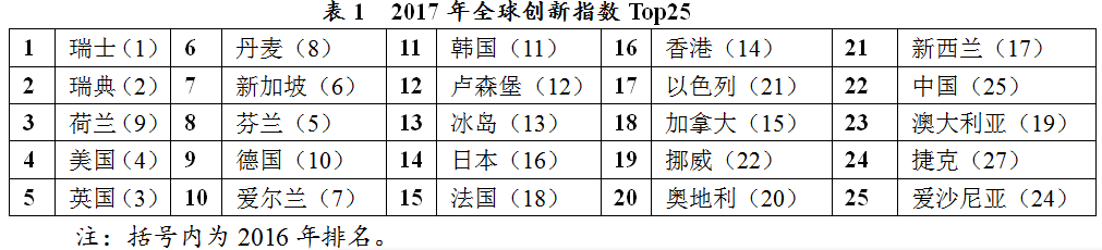 2017年,中国名列创新排行榜第22名,2016年名列25,是第一个跻身前25名的发展中国家。