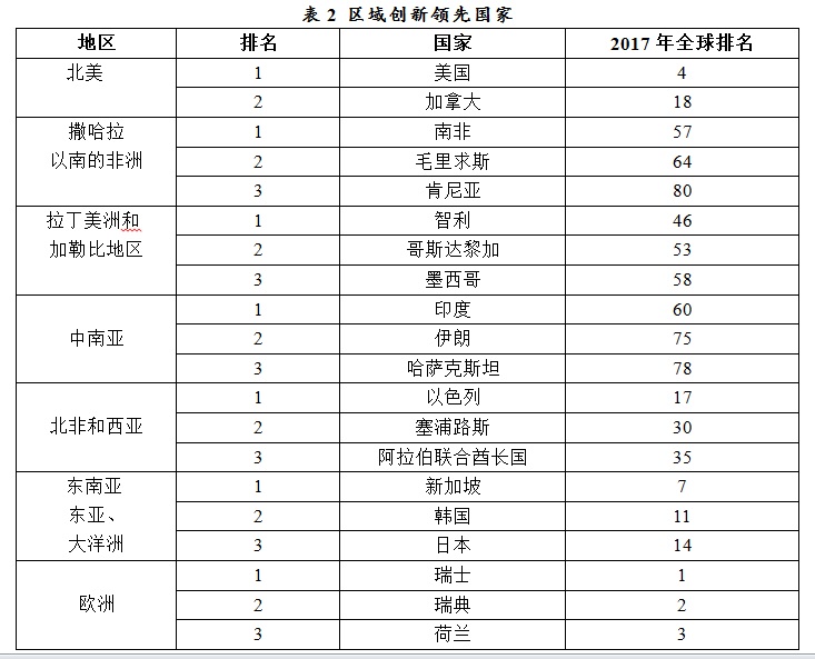 印度崛起,成为亚洲新兴创新中心,撒哈拉沙漠以南的非洲地区创新能力表现不俗;拉丁美洲和加勒比地区具备创新能力提升的机会。