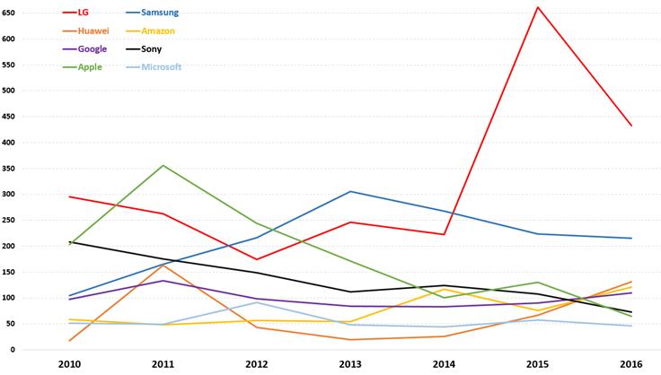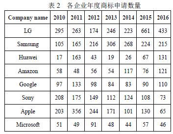 (3)一直位居首位的苹果公司在2016年仅申请了不到70个商标,相对2016年减少了100%,由此引起大量关注。苹果公司商标申请减少的原因可能是创立的新品牌越来越少,同样的情况也曾发生在其他企业(例如LG、索尼和微软)。世界商标评论认为在激烈竞争的创新产业中,已有的产品品牌和创立新品牌都至关重要。