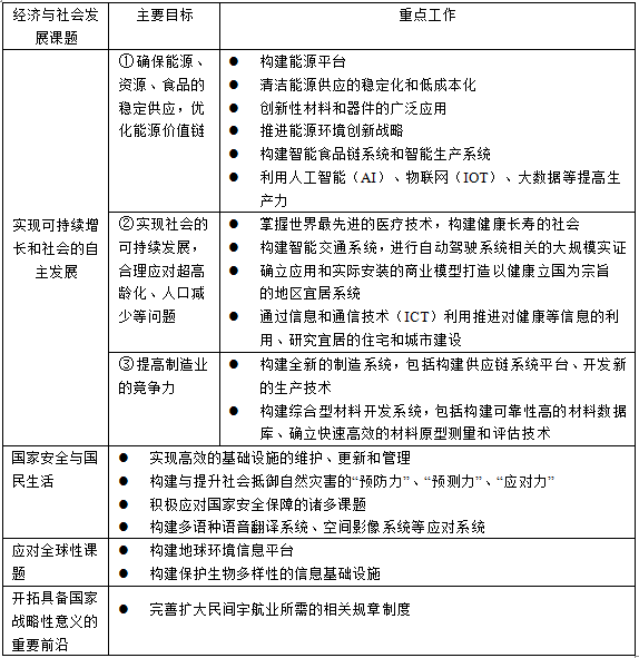 (1)构建与活用数据库,使其成为创造新价值和新服务的基础。重点构建基于G空间和自动驾驶地图的“地理数据库”、基于气象数据和卫星的“环境数据库”以及有助于收集网络攻击等信息的“网络安全数据库”。