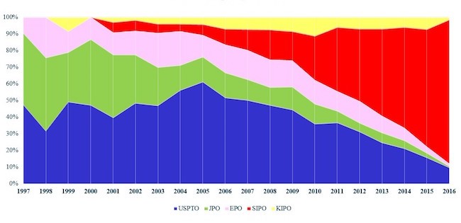 在20世纪90年代末和21世纪初,日本一度和美国旗鼓相当;然而2005年日本被欧洲超越,位居第三;2008年中国超过欧洲和日本;2011年,中国超越美国成为UAV技术最大的专利保护地。时至今日,中国一直处于UAV专利申请的首选国家。